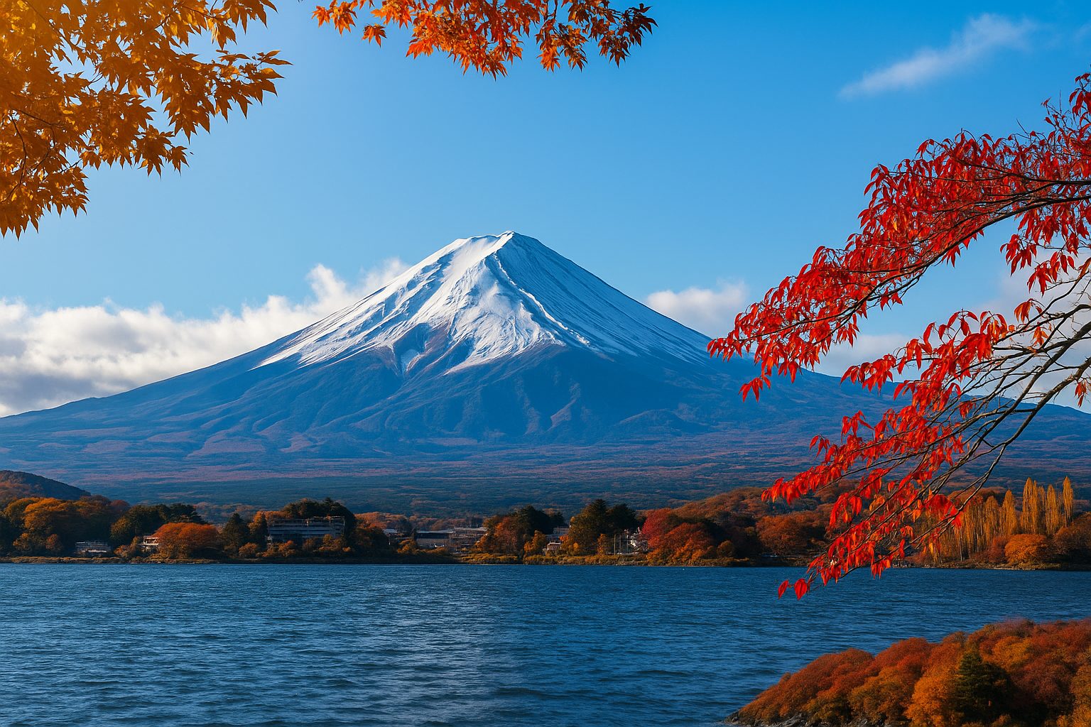 - 富士山と紅葉が織りなす富士五湖エリアの壮大な景色