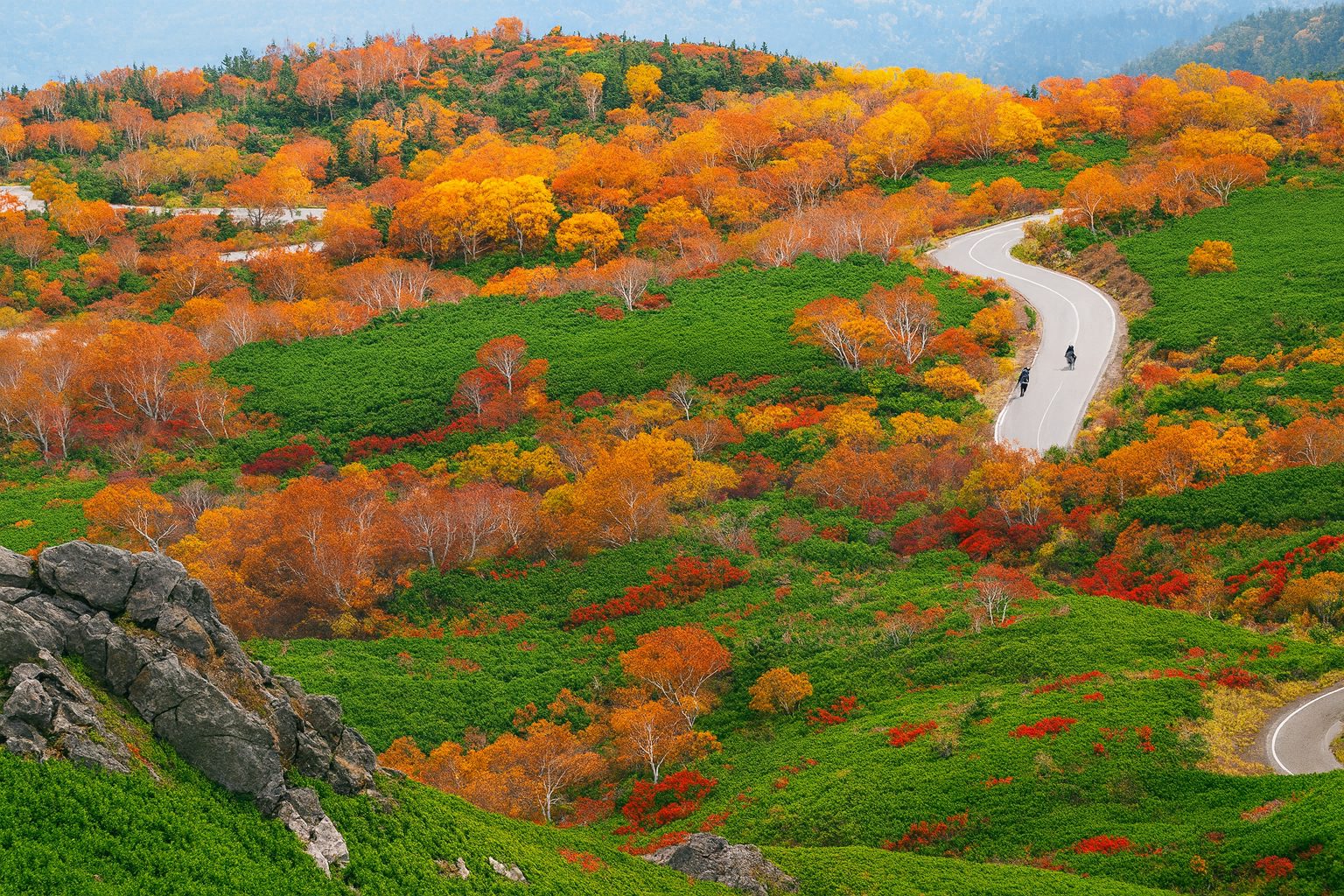 カエデやダケカンバなどが赤や黄色に染まり、雄大なパノラマ景観を楽しめます。